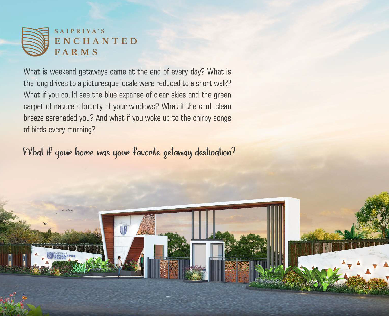 Sai Priya's Enchanted Farms located at Srisailam Highway, Kothur offers Best Place with numerous opportunity to achieve a fulfiling lifestyle.Spread Over 101 acers layout of green lands with beautiful hill views. Located off the Srisailam Highway, Near to the proposed Pharma City (19,000 acres), Sai Priya's Enchanted Farms presents a zero pollution environment.